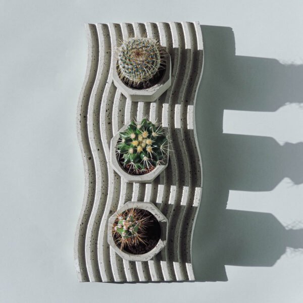 Pilkos spalvos betono padėkliukas su vazonėliais sukulentams